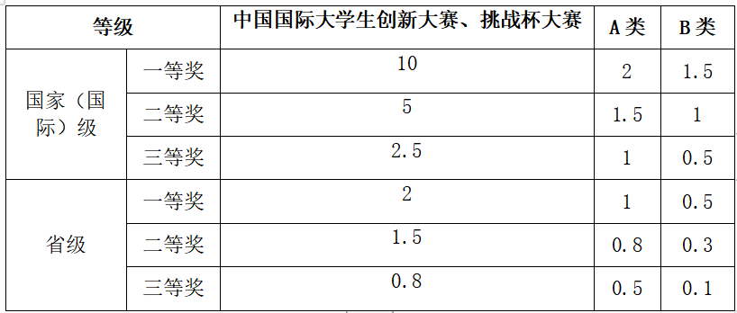 由教育部、共青团中央、教育厅等行政部门主办的比赛列为A类赛事,其余为B类赛事。若竞赛项目未安排省赛,则国家级比赛项目按照省级比赛项目予以认定。每项赛事只取最终比赛设置奖项的前三项,如特等、一等、二等,金奖、银奖、铜奖等。竞赛团队成员按负责人以及成员位次认定分数逐级递减。