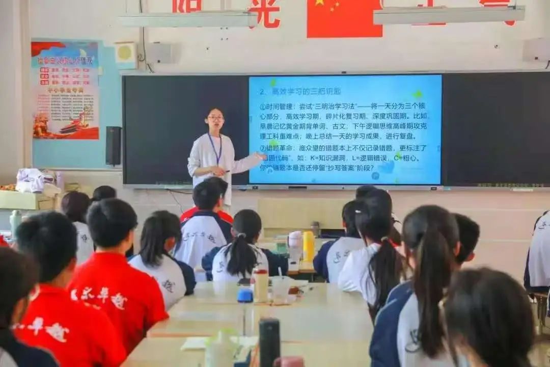下午,见习生们迎来了一次特殊的挑战。为了让红色精神在青少年心中深深扎根,见习生们走上讲台,为宜川中学初高中学子带来“延安精神薪火传,青春励志筑梦行”主题班会,活动内容精彩纷呈,形式别具匠心。他们精心准备,结合自身经历,从高考的拼搏、中考的奋斗、老员工活的丰富多彩,到理想的追逐、未来的规划等多个角度,为中员工们带来了一场场充满激情与温度的分享。有的同学讲述自己如何克服学习困难,实现成绩逆袭;有的同学描绘大学的丰富生活,激发中员工对未来的向往;还有的同学以榜样人物的故事为引,鼓励大家树立远大理想,勇敢追逐梦想。课堂上,见习生们真诚的话语、生动的讲述,深深打动了在场的每一位中员工。互动环节中,中员工们踊跃提问,见习生们耐心解答,现场气氛热烈而融洽。这场双向的交流互动,不仅为中员工们注入了学习动力和成长信心,也让见习生们在实践中锻炼了沟通表达和组织能力,实现了从员工到“教师”角色的初步转变。