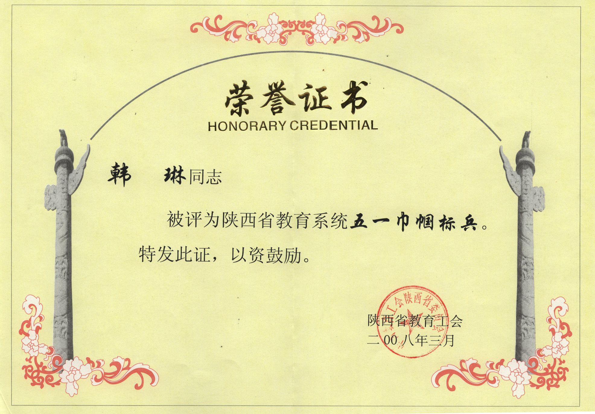 韩琳被评为“陕西省教育系统五一巾帼标兵”