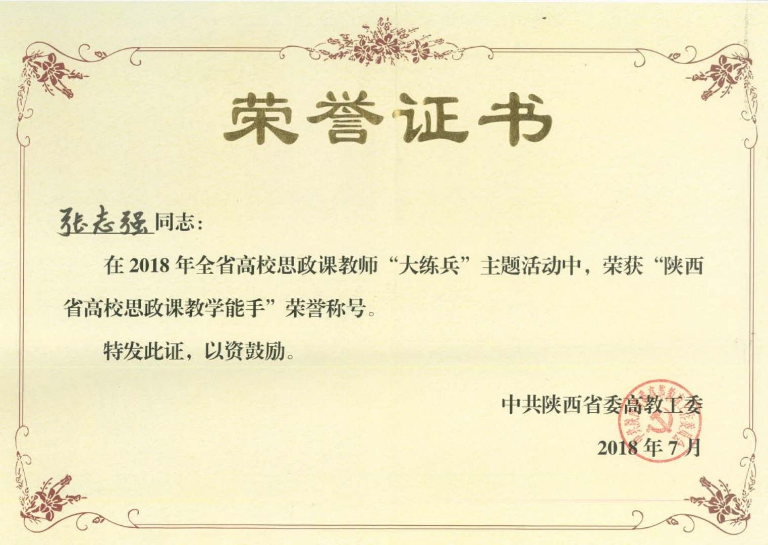 2018年全省高校思政课教师“大练兵”——张志强获“陕西省高校思政课教学能手”称号