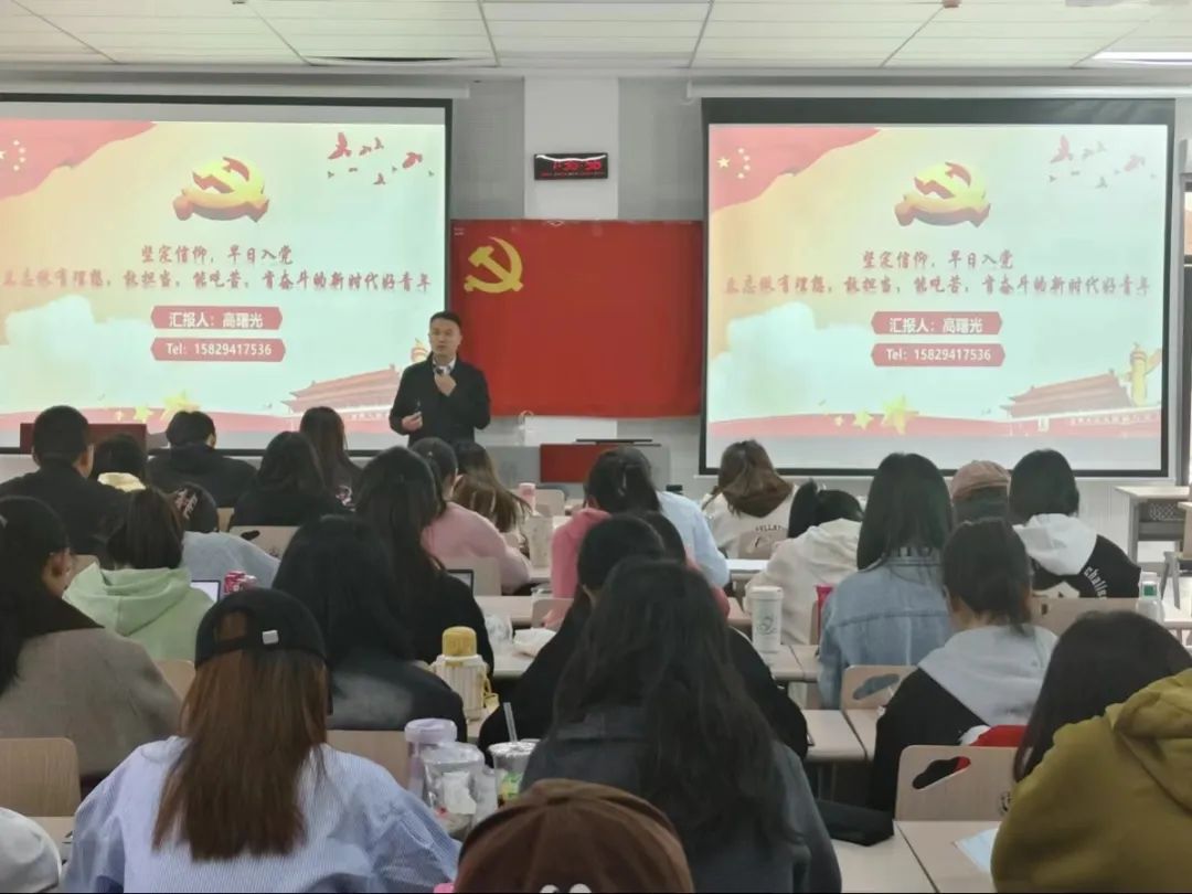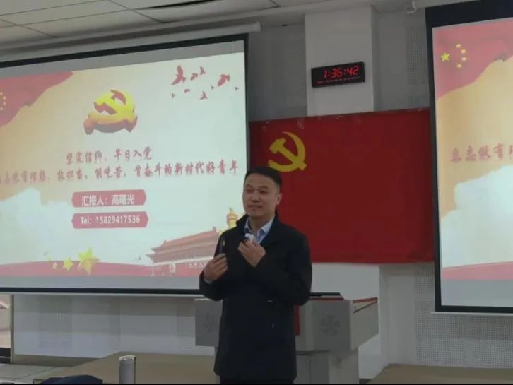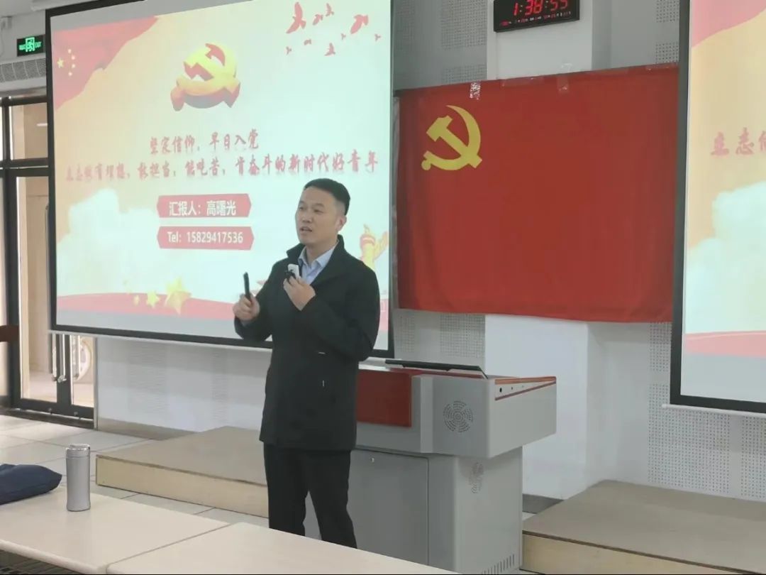 首先高曙光老师分析了目前入党的形势,当下的入党名额有限,竞争十分激烈,告诫同学们珍惜来之不易的入党机会,努力提高自身党性修养,在未来的学习工作中,积极履行党员义务,做一个合格的中华民族建设者。习近平总书记曾寄语新青年:“青年兴则国家兴,青年强则国家强”,青年是国家的支柱和希望,“士不可以不弘毅,任重而道远”,为新青年树立远大理想提出殷切期望。这些期望饱含着总书记对我们当代青年的重视和关爱,也是对我们的激励和鞭策,同时也意味着作为新青年的我们需要肩负起时代赋予的崇高使命。