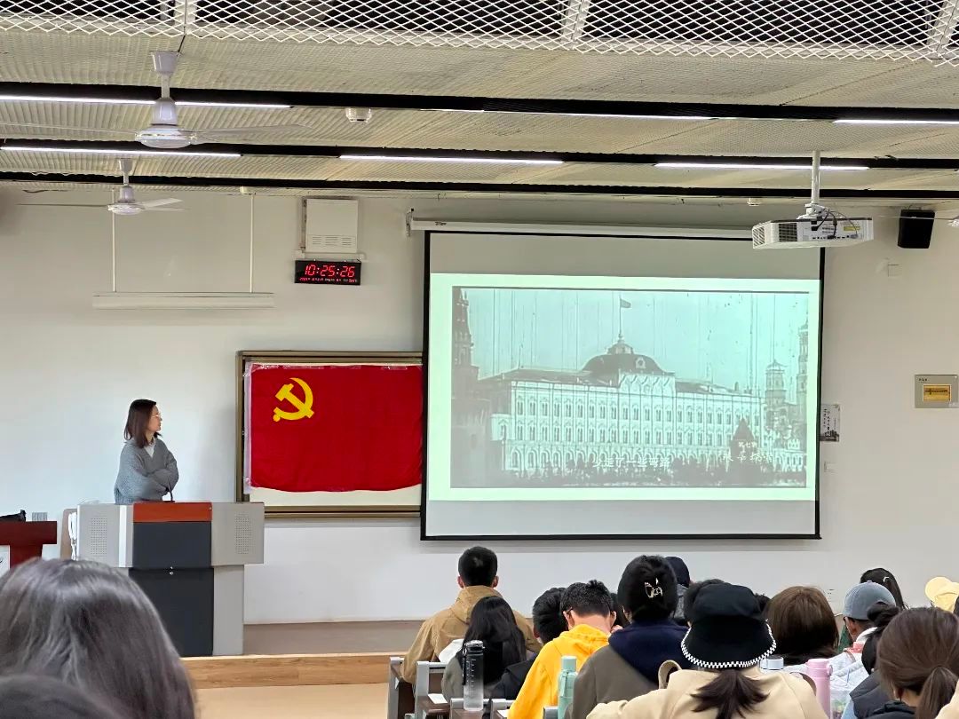 最后苗老师将党的发展历史与当代发展相结合,向同学们介绍了,“一带一路”、“人类命运共同体”等。中国共产党发展最新的的成果。并鼓励同学们要开拓创新,敢于斗争,紧跟党的脚步,不怕困难与牺牲。努力为中国共产党的事业与中华伟大民族复兴展现青年力量。