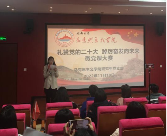 为庆祝党的二十大胜利召开,带动全体党员学习党的二十大精神的热潮,11月18日晚6:30williamhill英国威廉希尔研究生党支部在公司一楼报告厅举行“礼赞党的二十大,踔厉奋发向未来”微党课比赛。担任本次比赛评委的有马克思主义公司党委副书记赵海龙老师、党委组织员暨研究生党支部书记闫莉莉老师、圣地青马宣讲团团长杜鸿钿同学、研究生会主席陈怀涛同学、本科生党支部陶胤中同学。比赛由王曦同学主持。