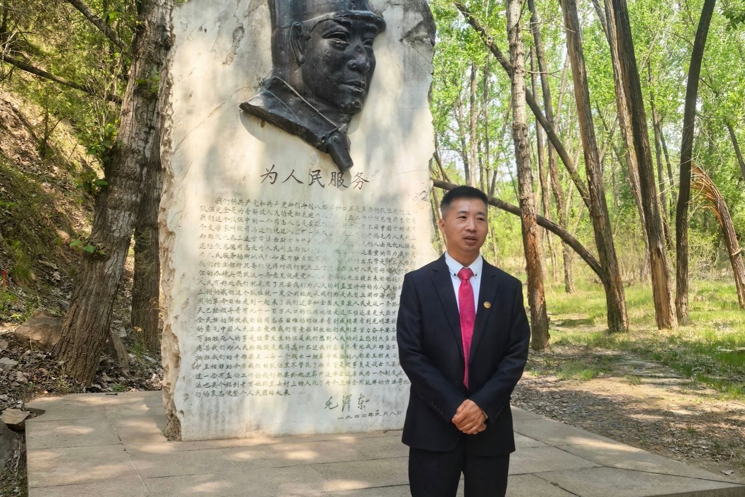随后,党员们怀着崇敬之情来到了为人民服务讲话台。1944年9月8日,毛泽东主席在此发表了著名的《为人民服务》讲演,高度赞扬了张思德同志全心全意为人民服务的崇高精神。站在讲话台前,张思德同志负薪前行的雕像庄严肃穆,“为人民服务”五个鲜红大字在阳光的照耀下闪耀着光芒。高志奇副教授为党员们详细讲述了张思德同志的生平事迹——从一个贫苦农民的孩子,成长为一名优秀的共产党员,在平凡岗位上默默奉献,直至为人民利益牺牲生命。这一故事深深触动了每一位党员的心灵,让大家深刻认识到,“为人民服务”并非只是一句简单的口号,而是实实在在的行动,是无私奉献、舍己为人的崇高精神体现。这种跨越时空的精神,在新时代依然熠熠生辉,激励着每一位党员为人民幸福不懈奋斗。