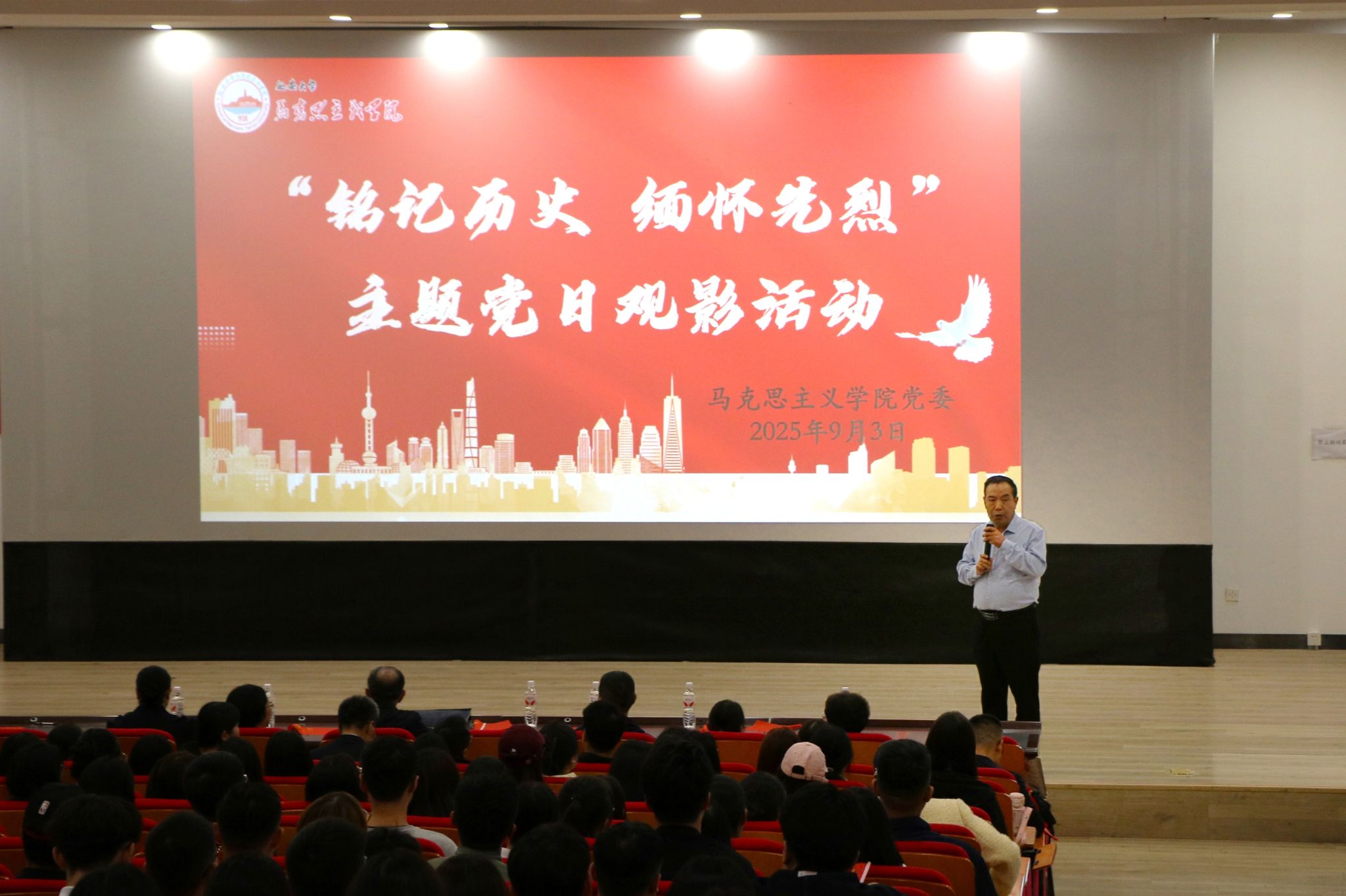 为进一步深化爱国主义教育,传承伟大抗战精神,9月3日上午,马克思主义公司党委组织全体师生在老员工活动中心红色影院开展了“铭记历史 缅怀先烈 珍爱和平 开创未来”主题党日观影活动。活动由党委书记张彬主持。