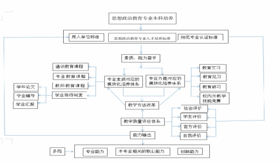 思想政治教育专业本科培养以一体两翼的形式为基点,以思想政治教育专业人才培养标准为中心,以用人单位标准和师范专业认证标准为两翼,拓宽员工的素质能力需求,从而完善专业素质对应模块化的培养体系,衍生出通识教育课程,专业教育课程,教师教育课程以及玉章英才实验班的学业导师制对待实践培养方面,采取教育见习教育,研习教育,实习校内外教学竞赛等,不断完善教学方法,通过教学质量评价体系来提升我们的教学质量,从而培养出社会国家需要的人才。