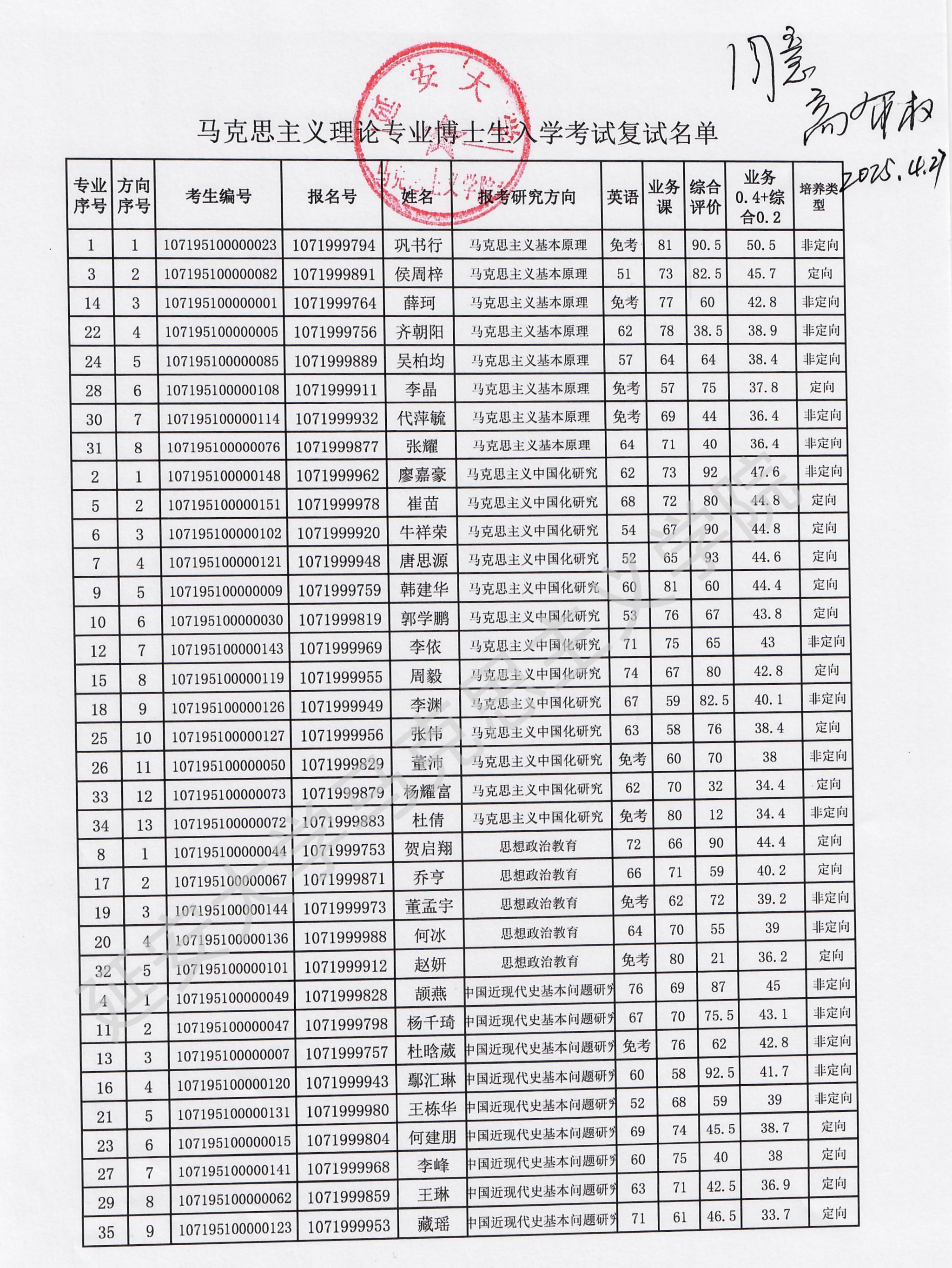 williamhill英国威廉希尔马克思主义理论专业博士生入学考试专业课、综合评价与英语测试等考试已结束,现将考试成绩及复试名单公布如下。