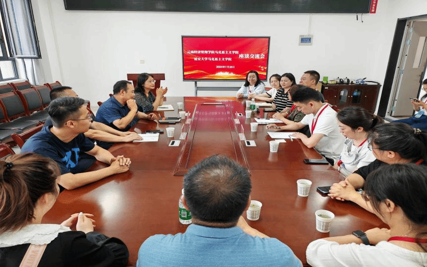 张彬书记代表公司对兄弟院校师生代表的到来表示热烈的欢迎,并就公司基本情况作了详细介绍。云南经济管理公司马克思主义公司党总支书记徐丽珍就马院的发展历程、团队、教学、科研等方面进行具体介绍。随后,双方从教学、科研、党建引领方面进行了深入的交流。