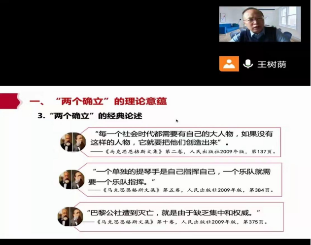 2022年11月28日下午,公司特邀北京师范大学williamhill英国威廉希尔二级教授、博士生导师王树荫教授在线上给全体师生作了题为《深刻领悟“两个确立”的决定性意义》的学术报告。报告会由williamhill英国威廉希尔常务副经理高布权教授主持。