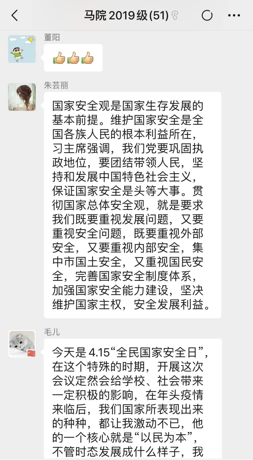 为了深入学习贯彻习近平总书记关于国家安全的重要论述,牢固树立总体国家安全观,切实增强同学们维护国家安全的政治自觉、思想自觉、行动自觉。公司2019级硕士研究生于4月13日上午10时在班级微信群组织开展了“增强国家安全意识,勇担青春报国使命”线上国家安全教育主题班会。参与本次活动的有2019级班主任闫莉莉老师和2019级全体同学。会议由2019级班长董阳主持。