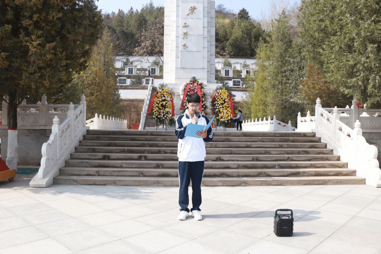青山有幸埋忠烈, 浩气无形化丰碑。在纪念碑前,同学们庄严肃立,马玉同学带领大家行鞠躬礼,并带领大家宣誓。庄严的时刻,郑重的誓言,不能忘的是革命先烈的精神意志,不能舍的是革命先烈的光荣传统,不能停的是接续创造的辉煌业绩。
