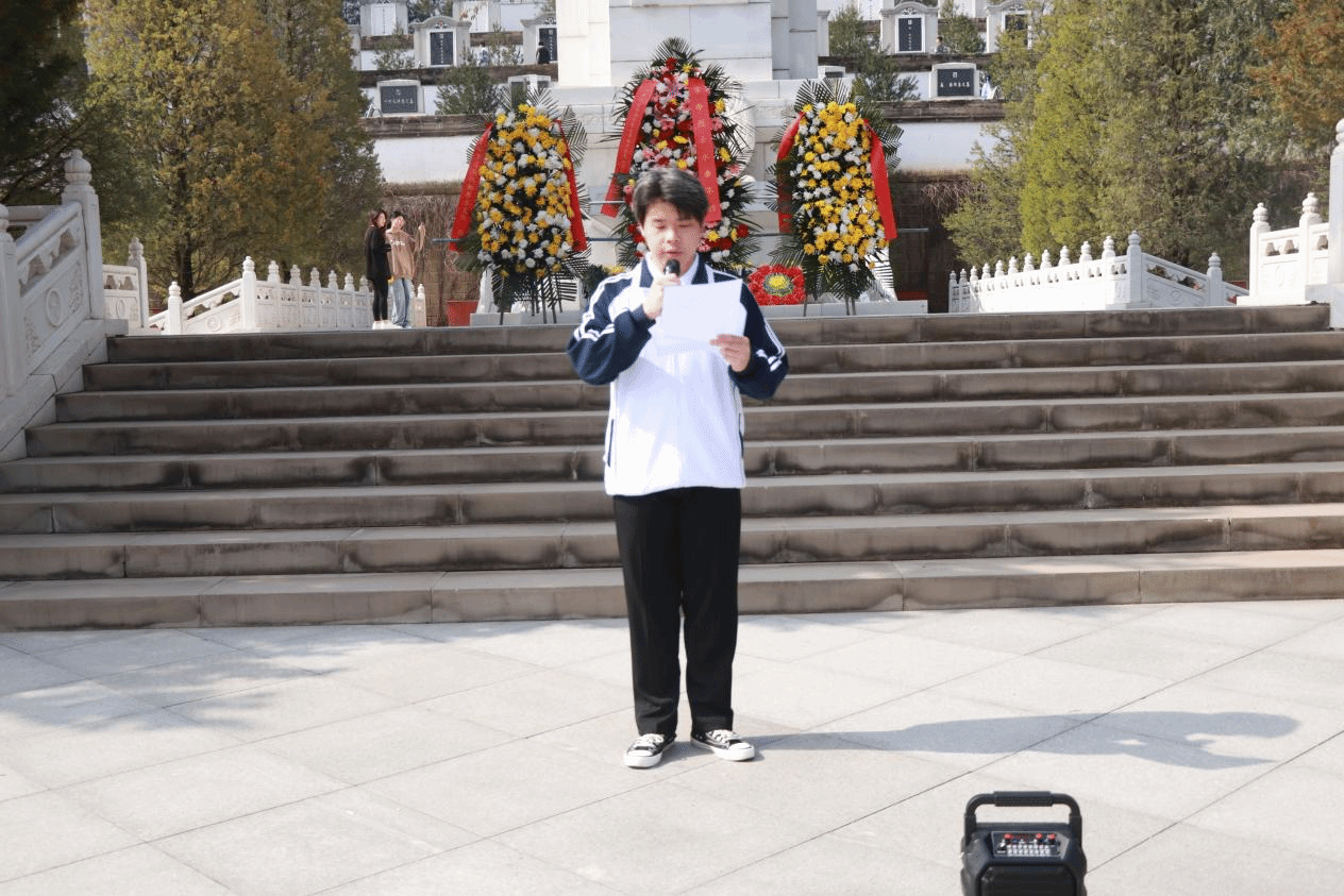 吴苏怡同学和李雨珂同学合诵《清明》,王思雨同学和孟申奥同学合诵《清明》。“清明时节雨纷纷,路上行人欲断魂。”在烈士墓前,在四月的春风里,在他们的朗诵中,悲情从字里行间流出,将对烈士的哀思与敬仰传递给每一位在场的同学。