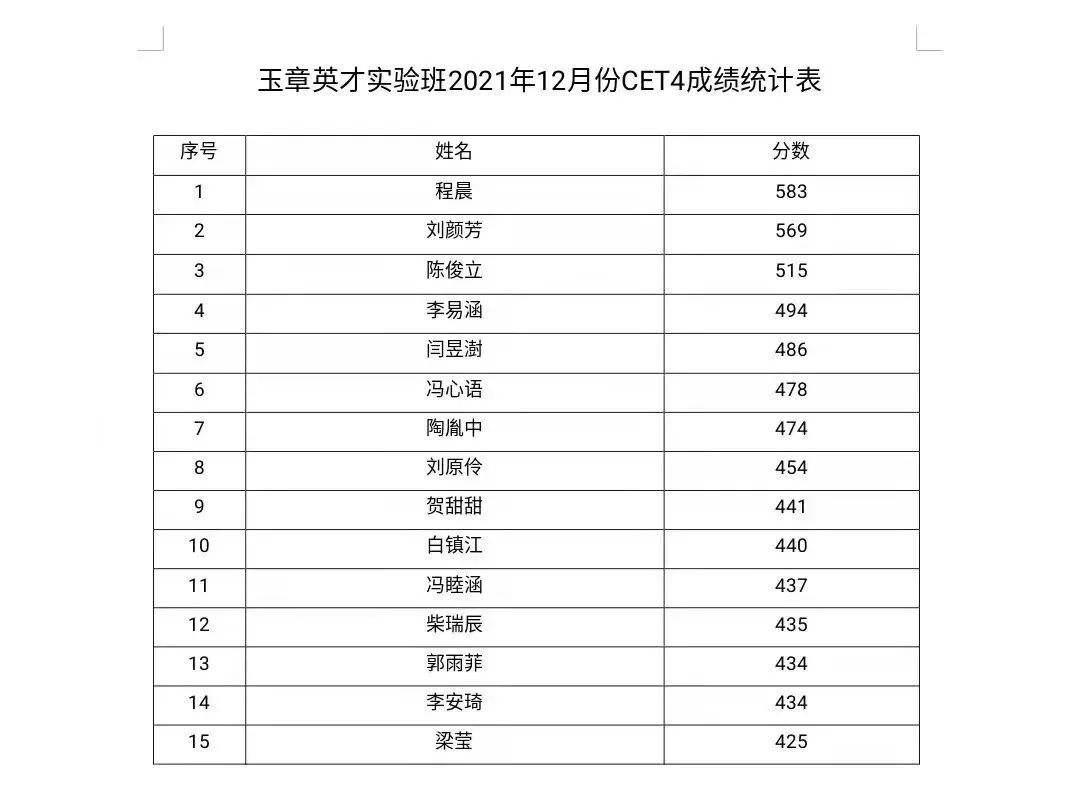 2021年3月,2020级玉章英才实验班正式成立,成立之初,公司院领导为玉章20举办了隆重的开班仪式,介绍了玉章班的设立初衷、培养目标、培养方案和管理办法,并为每位同学配备了学业导师。玉章20同玉章19积极交流、沟通、学习。以优秀的学长学姐为目标、为榜样,把玉章班学风好好的传承下去。玉章20坚持每日跑早操、上早读、上晚自习,这让他们能够静心学习,认真备考。此次英语四级考试,便是玉章20所面临的第一次考验。在玉章20班委的管理下,全体同学于考试前十周进行每周两次的听力训练,并于考试前四周进行每周一次的全真模拟考试训练。此举营造出了很浓厚的学习氛围,激发出同学们的学习热情。在院领导、导师和全体任课老师的亲切关怀下,玉章20全体同学辛勤努力、刻苦学习,在首次四级考试中取得佳绩。