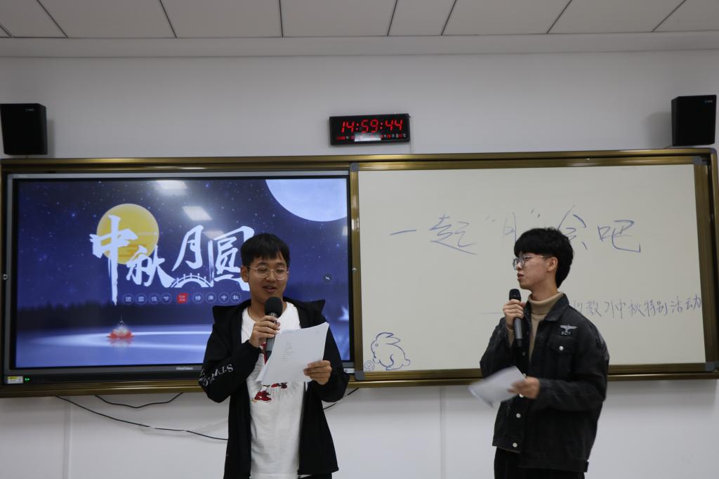 晚会在陈思敏同学和王博强同学的朗诵《中秋之夜》中拉开了序幕,声音浑厚的男声与喉清韵雅的女声把同学们带入晚会的氛围。高宇飞同学和张恒弢同学表演相声《满腹经纶》,幽默的相声不仅令台下同学捧腹大笑也蕴含着胸中万千文章,才能做到满腹经纶这一深刻人生哲理,极具教育意义。覃生耀同学模仿新闻主持唯妙唯俏,令台下观众佩服至极。