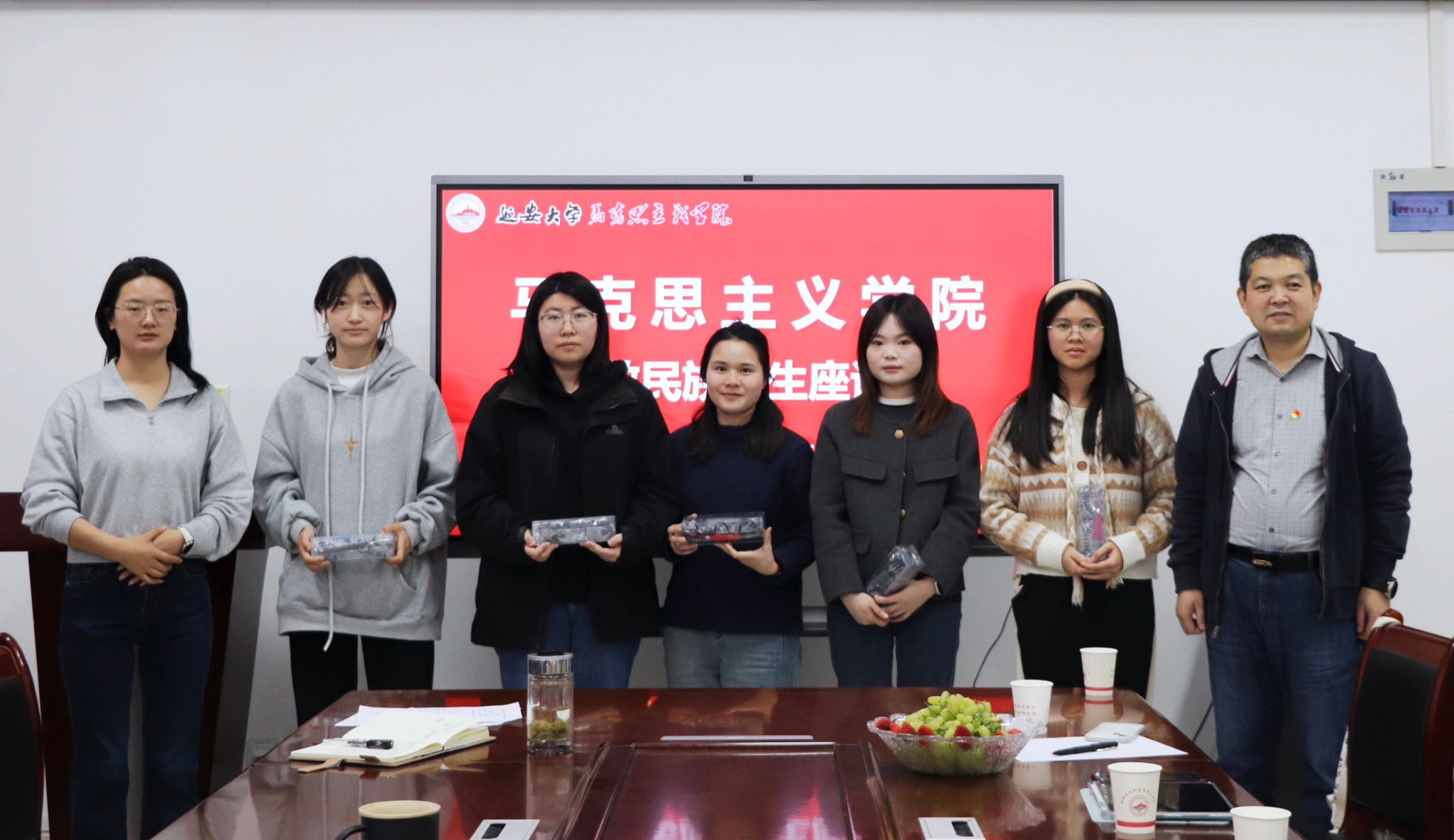 座谈会尾声,刘建华老师立足马克思主义理论视角,对此次会议的研讨成果进行了系统性总结。他援引陕北地区民族融合的历史传统,指出“和而不同”的文化智慧对当代社会的启示意义。强调新时代青年要善用马克思主义立场观点方法促进文化互鉴,寄语学子“既要做文化传统的守护者,更要当文明交融的践行者”。会后,公司老师们向在场少数民族员工逐一赠送带有民族特色的专属纪念品并合影留念。