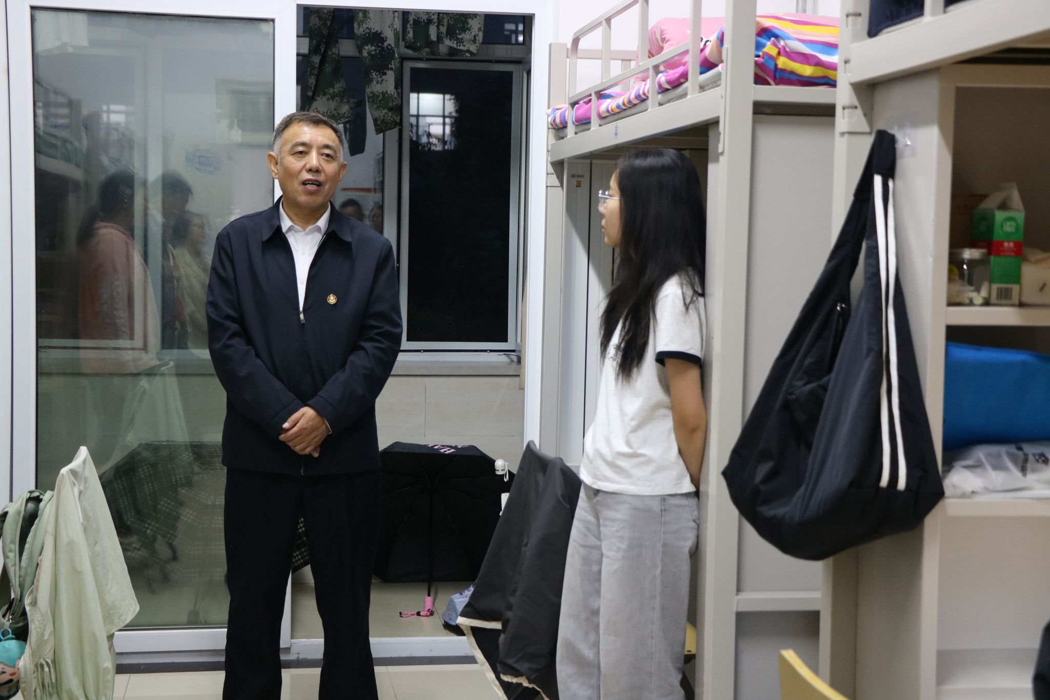 走进新生宿舍,公司领导与每位新生进行了亲切地问候与关怀,就住宿环境、饮食条件、开学准备等细节与同学们深入交流,并表示今后无论遇到学习上的困惑,还是生活中的难题,都可以随时向辅导员或公司办公室寻求帮助。此外,公司领导还特别叮嘱同学们,要学会彼此尊重、互帮互助,携手打造安全文明、和谐舒适的生活环境。