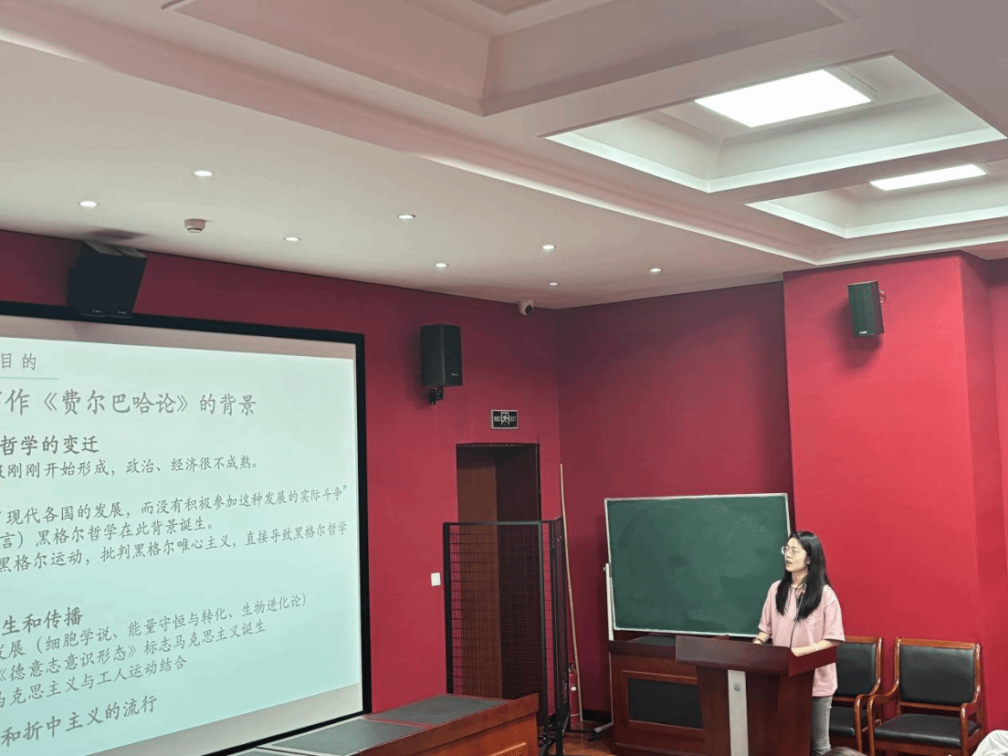 刘佳佳同学主要从《费尔巴哈论》的写作背景、文本内容和地位进行研读。《费尔巴哈论》是恩格斯1886年所写,文章主要内容是由一个单行本序言、四个章节及结束语组成。她首先讲述了恩格斯写作的目的:一是全面系统地说明马克思主义哲学和德国古典哲学特别是和黑格尔、费尔巴哈哲学的关系;二是用马克思主义科学的世界观武装工人阶级,指导工人运动,抵制德国古典哲学复活的反动趋势。