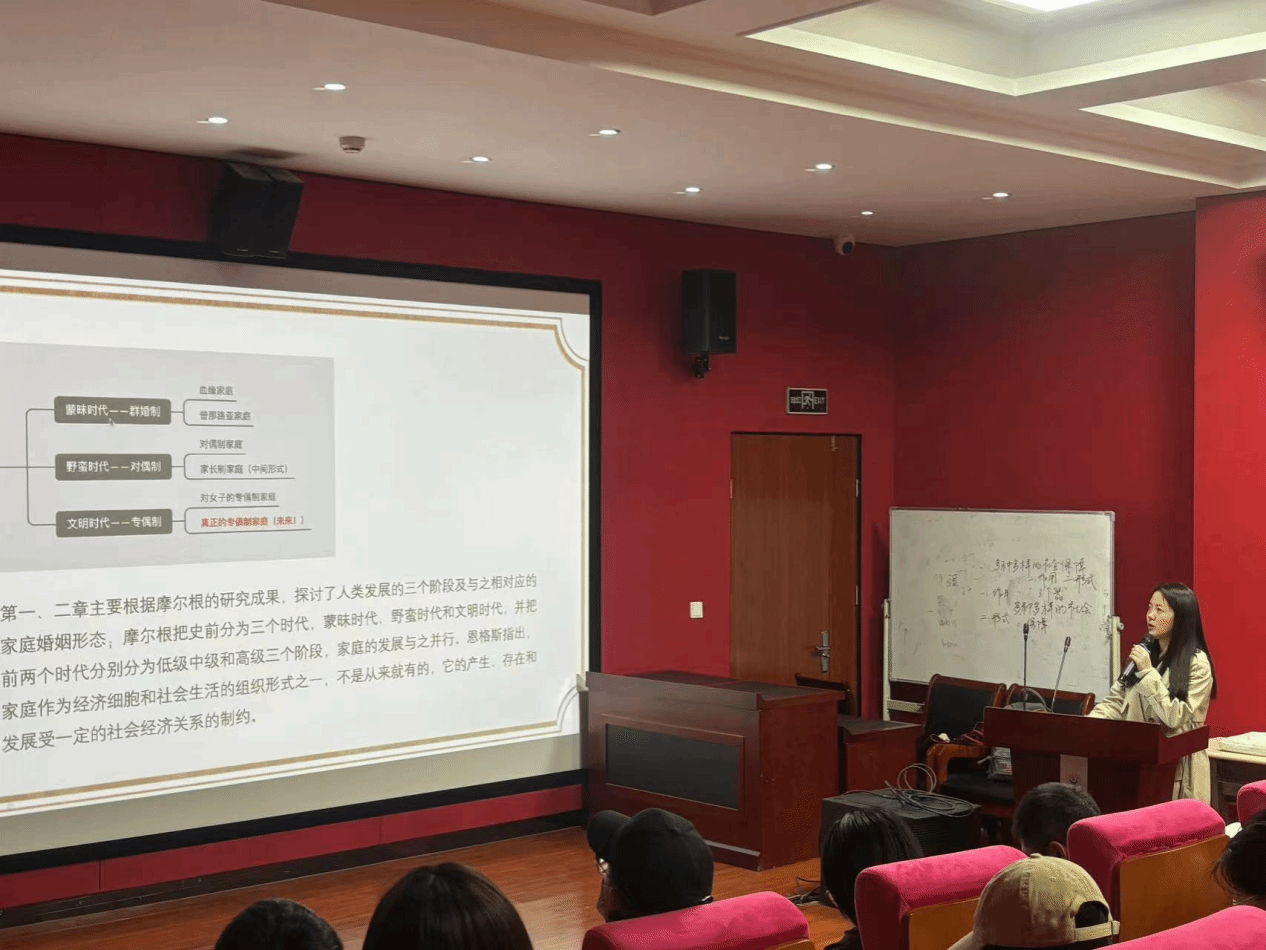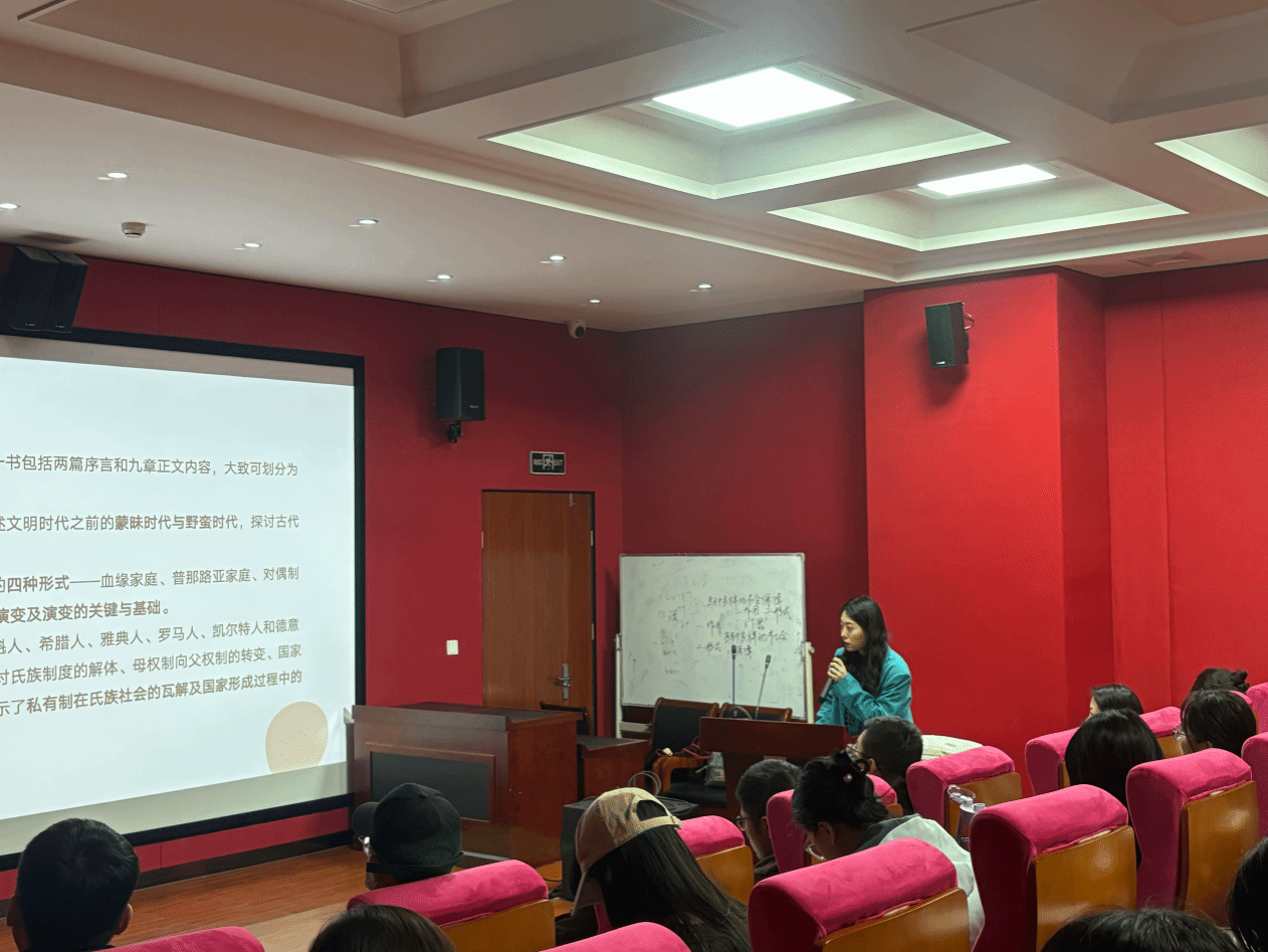 王姣同学对写作背景和当代价值两个方面进行了补充。首先,她介绍了《起源》一书的历史背景。从理论方面来看,撰写《起源》是为了通过系统的研究和阐述原始社会史,进一步发展和丰富唯物史观。从实践方面来看,撰写《起源》是为了批驳资产阶级在家庭、私有制和国家问题上散布的谬论,用科学的理论武装工人阶级及其政党,推动国际工人运动深入发展。随后,她从六个方面介绍了该著作的当代价值:第一,第一次基本建立起原始社会史的科学体系;第二,第一次系统阐述人类社会发展一般经历的几种生产方式;第三,第一次结合历史资料系统、科学的阐述了私有制和国家的起源;第四,揭示了奴隶制、封建制发展过程的一些重要规律;第五,进一步改造了关于人类社会及其历史学说的面貌;第六,树立了正确进行社会科学研究的光辉榜样。
