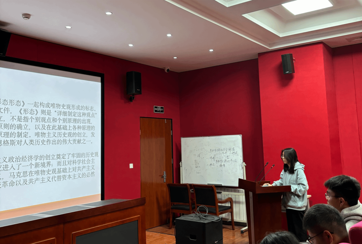 最后,崔妍同学指出了阅读《德意志意识形态》对于思想政治教育专业员工的启示感悟:作为思想政治教育的理论基础和发展基石,为其提供了科学指南;面对错误思潮要进行理性批判和大胆回应;进行思想政治教育工作要把握“现实的个人”以及开展思想政治教育必须从人们的实践活动出发等等。
