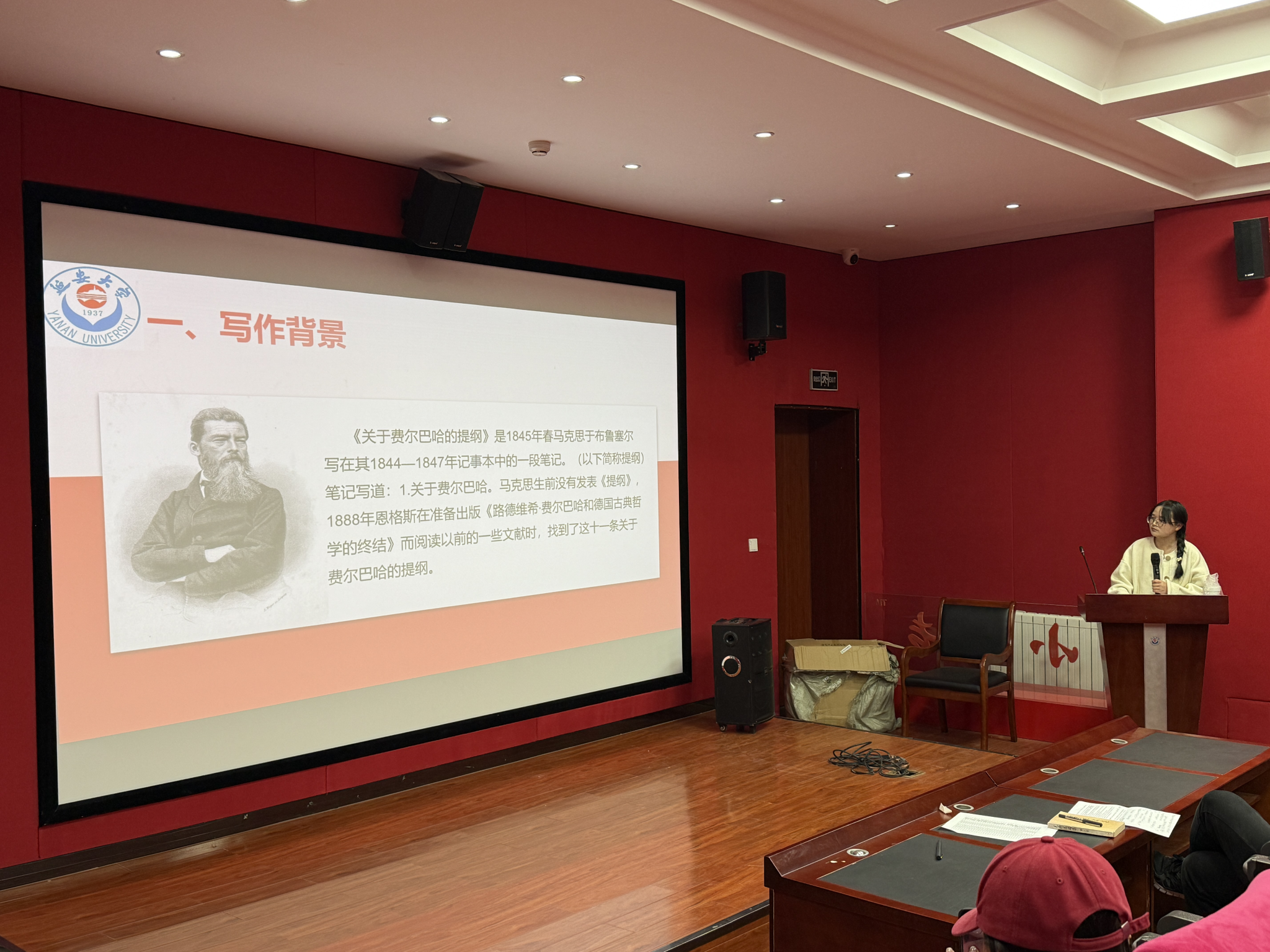 2025年5月14日,“马克思主义经典文献研读” 系列学术活动迎来第六十期,活动在williamhill英国威廉希尔一楼报告厅顺利举行。此次读书会聚焦于马克思主义经典著作,围绕《反对本本主义》《实践论》《矛盾论》以及《关于费尔巴哈的提纲》四部经典文献展开深入研讨。活动中,2024级思想政治教育方向的硕士研究生陈明明、杨帆、王科琳三位同学依次登台,就各自研读经典文献的心得与见解作了详细报告分享。